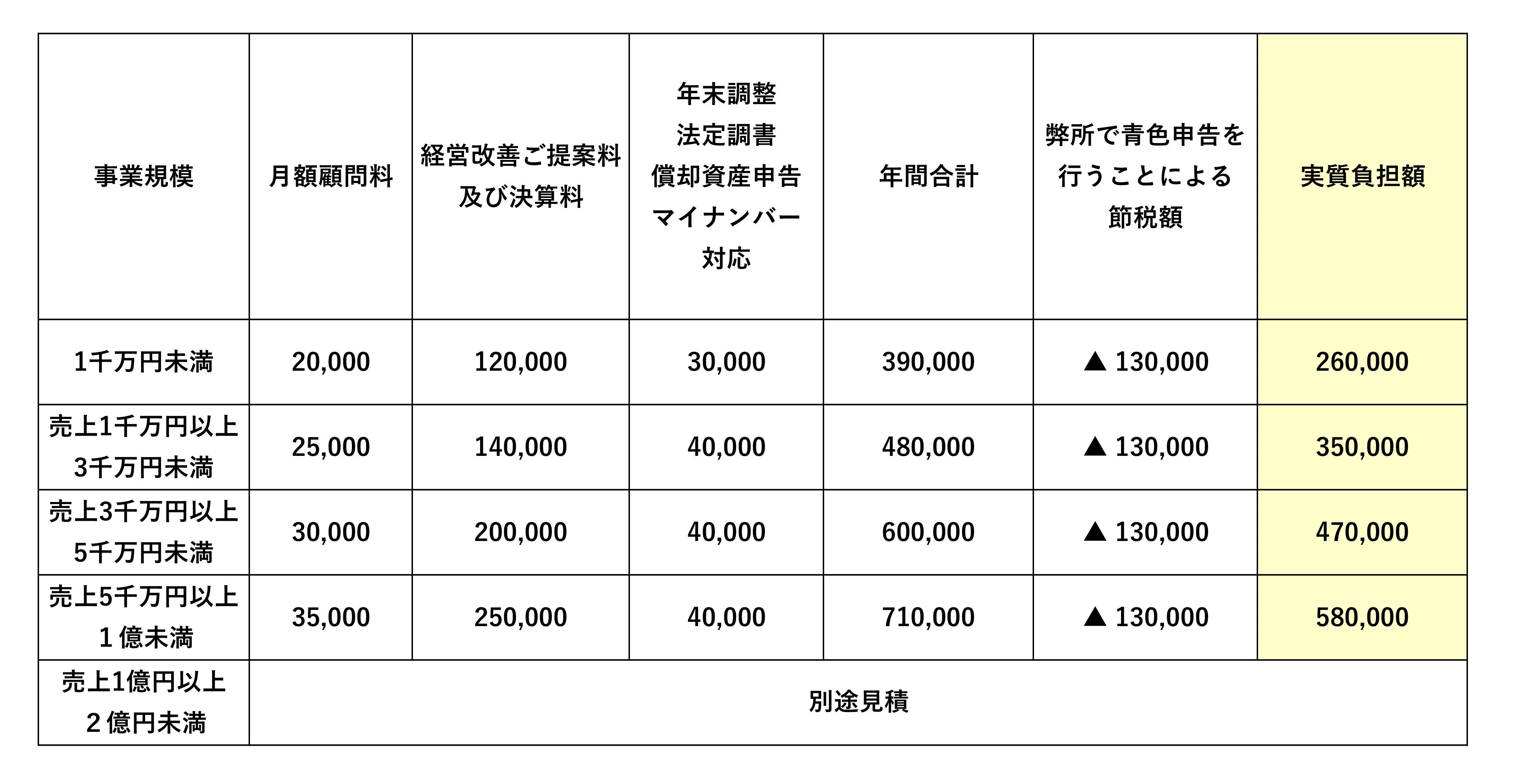 - 本則課税の場合:50,000円 軽減税率対応:50,000円 インボイス対応:月額5,000円